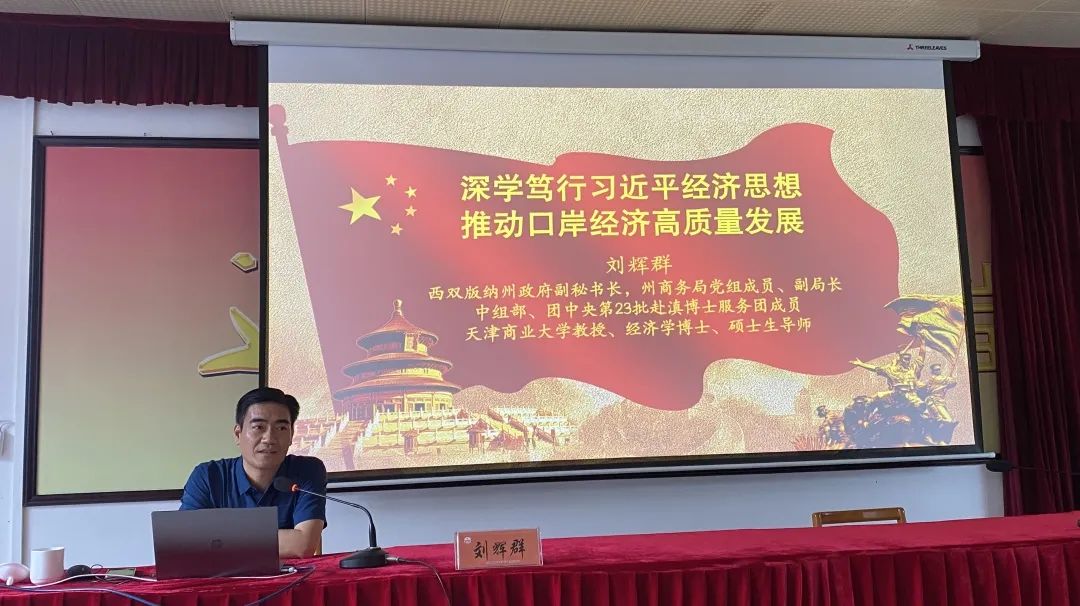 刘辉群充分发挥自身专业特长优势,以培训讲座、智力服务、设立专家工作站等方式,宣传先进思想,提供智力服务,努力做好提升干部能力本领的帮带者。经州委组织部推荐,刘辉群参加第二批云南省级云岭先锋讲师团,受邀做客云南省社科联联合新华网推出的《用实践回答》社科专家田野调查新媒体视频节目,通过田野调查生动讲述理论实践故事,深刻阐释习近平新时代中国特色社会主义思想的精髓要义。在第二批主题教育期间,刘辉群主动送课上门,先后为西双版纳州各企事业单位、州“青年马克思主义者培养工程”培训班及2023年景洪市对外投资贸易政策业务培训班作《深学笃行习近平经济思想 推动海关工作高质量发展》《指引中国迈向现代化强国的发展密码》《深学笃行习近平经济思想 持续推动营商环境优化》等专题辅导报告。